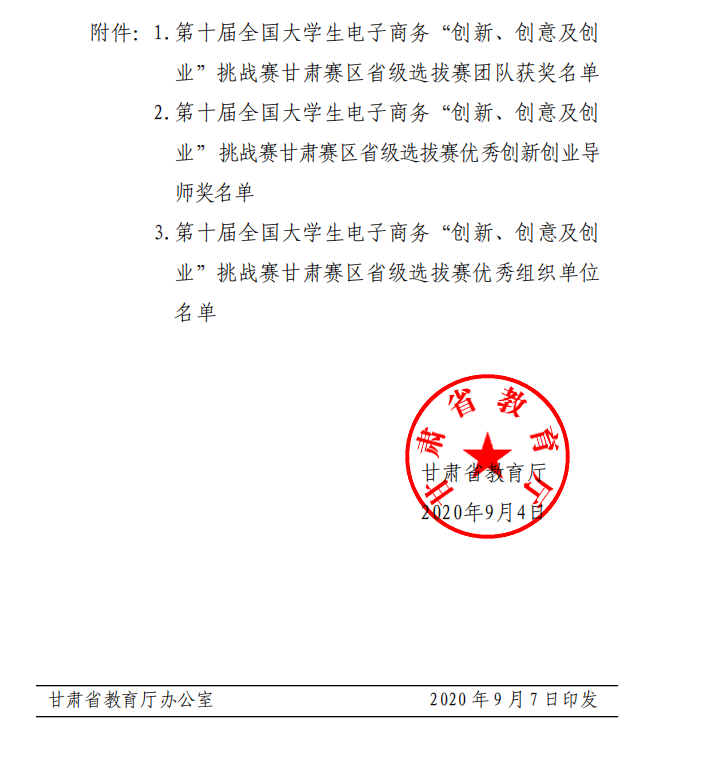 各高等院校: 按照《甘肃省教育厅关于组织第十届全国老员工电子商 务“创新、创意及创业”挑战赛甘肃赛区省级选拔赛决赛的 通知》(甘教高函„2020‟24 号)要求,第十届全国老员工 电子商务“创新、创意及创业”挑战赛甘肃赛区省级选拔赛 赛程已全部结束。本次比赛,共有来自全省 40 所高校的 2469 支队伍参赛。根据竞赛程序和规则,评选出甘肃赛区团队奖 278 项,其中特等奖 20 项、一等奖 38 项、二等奖 100 项和 三等奖 120 项,优秀创新创业导师奖 37 人、优秀组织奖 5个。现将获奖名单予以公布(见附件)。 希望获奖单位、团队和个人及时总结经验,持续推进创 新教育和实践教学改革,着力提高人才培养质量,为建设幸 福美好新甘肃,开创富民兴陇新局面贡献青春力量。