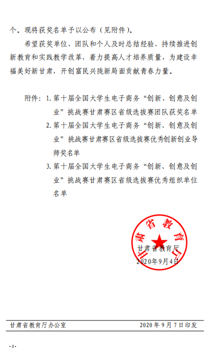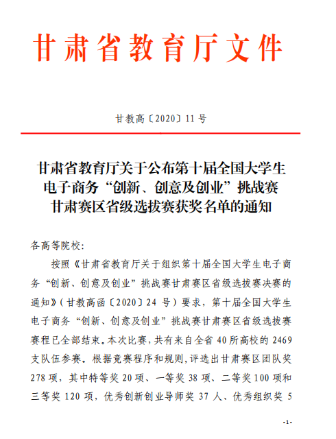 甘肃省教育厅关于公布第十届全国老员工 电子商务“创新、创意及创业”挑战赛 甘肃赛区省级选拔赛获奖名单