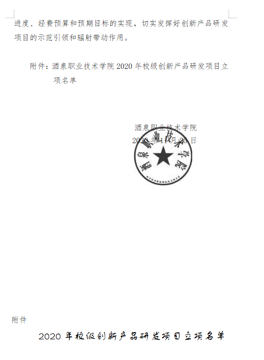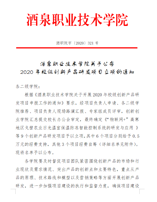 j酒泉职业技术公司关于公布2020年校级创新产品研发项目立项的通知