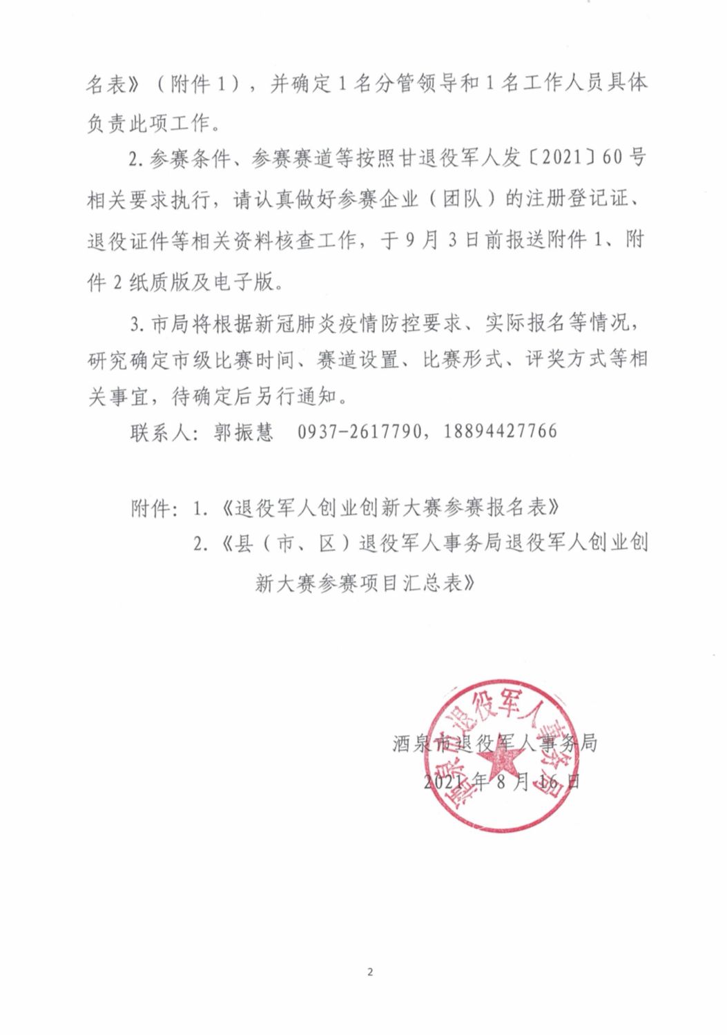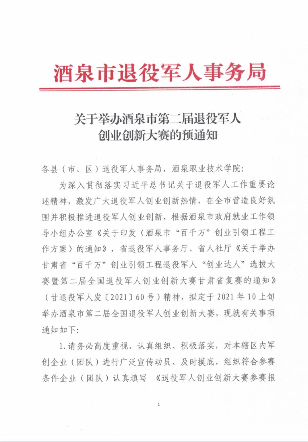 关于举办酒泉市第二节退役军人创新创业大赛的预通知