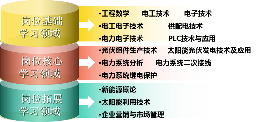 电工技术、电子技术、电力电子技术、供配电技术、PLC技术与应用、电气制图与识图、光伏组件生产技术、电力系统分析、电力系统自动装置、电力系统继电保护、太阳能光伏发电技术及应用、太阳能利用技术等,以及实践环节。