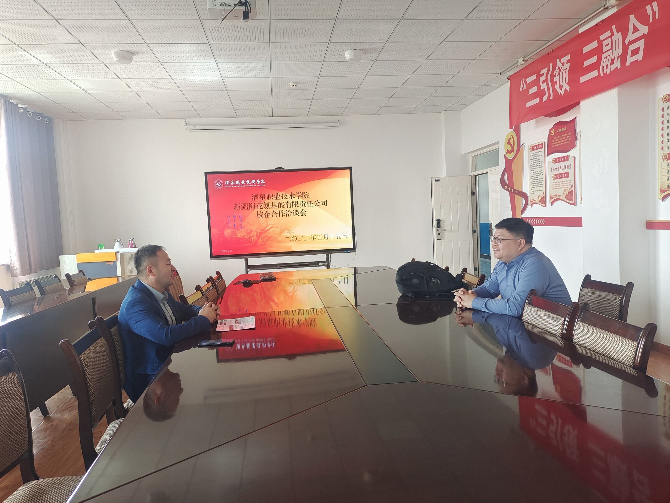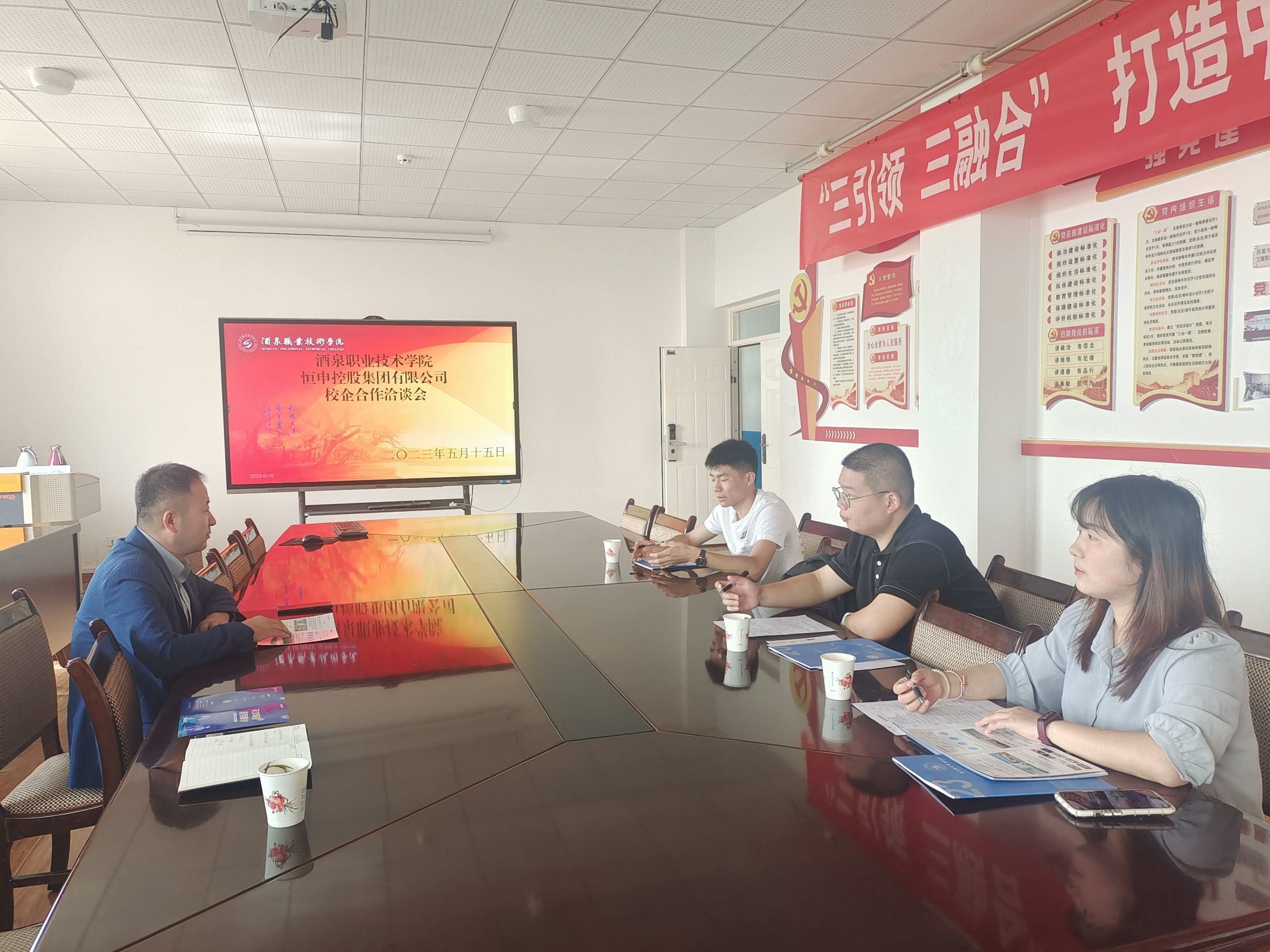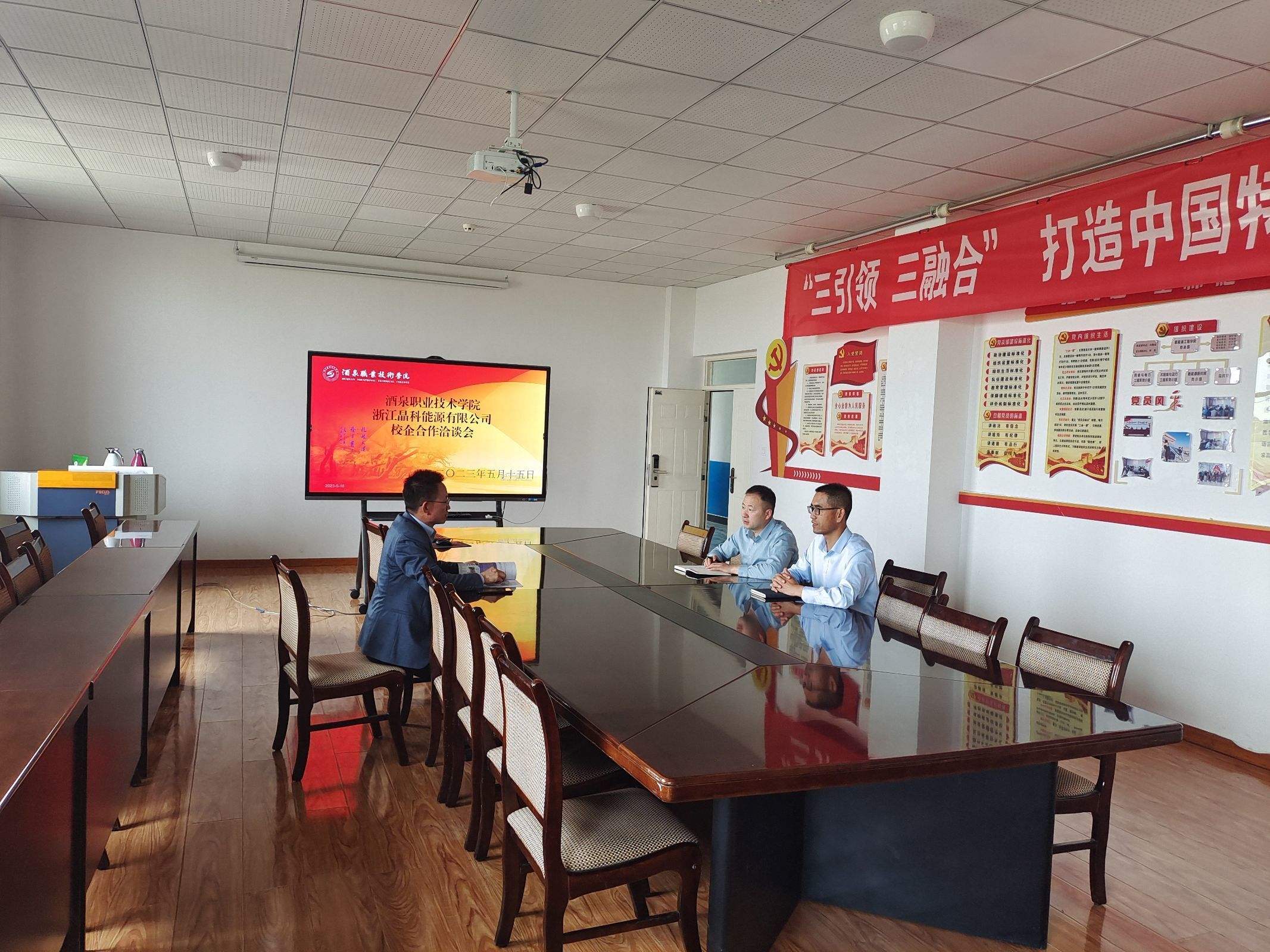 2023年5月15日,恒申控股集团有限公司人事经理张优雅、新疆梅花氨基酸有限责任公司人事经理肖遵毓、浙江晶科能源有限公司人事经理张一涵等企业代表莅临酒泉职业技术公司2026世界杯官网洽谈校企合作事宜。2026世界杯官网副经理张振伟与各位企业代表进行了座谈交流。