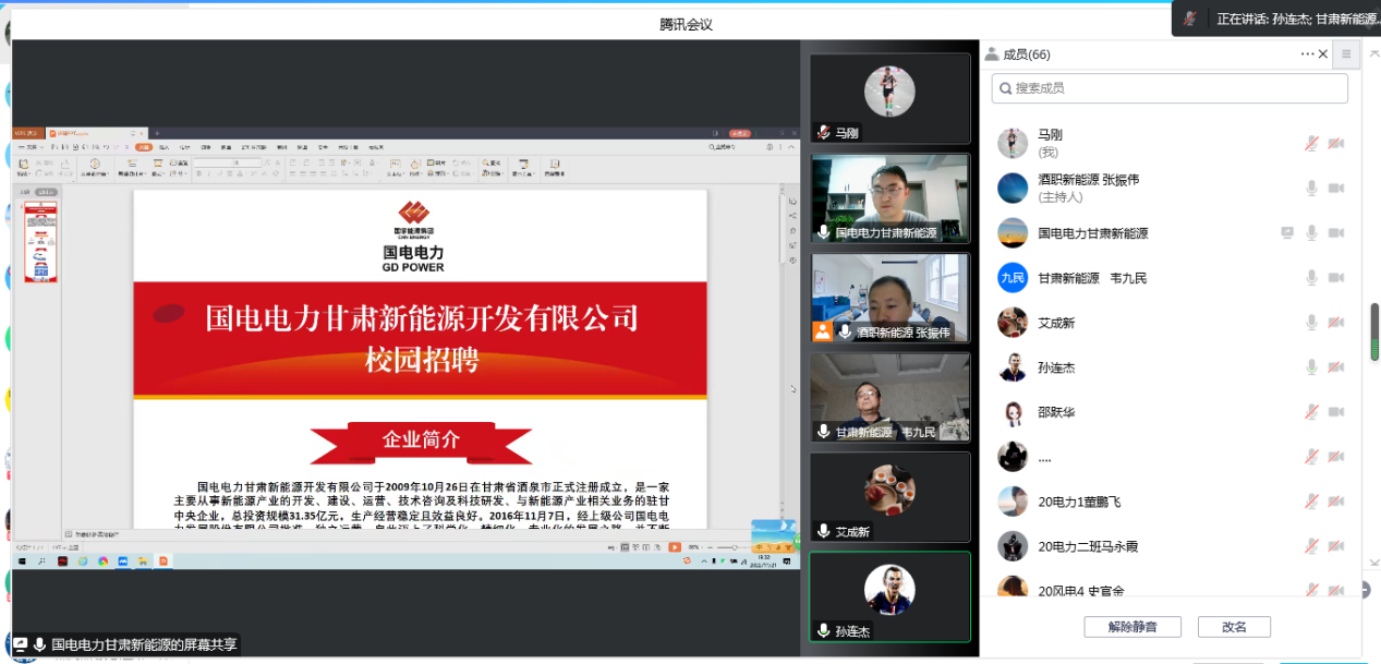 为提高公司毕业生就业质量,实现优质就业,2022年11月21日晚,2026世界杯官网邀请国电电力甘肃新能源开发有限公司通过线上云平台为2020级未就业员工举办了专场招聘会。公司副经理张振伟主持会议;国电电力甘肃新能源开发有限公司党委书记、总经理韦九民,党委委员、副总经理邵跃华,安全生产部主任艾成新,规划发展部主任孙连杰,人事主管常强出席了线上会议。公司70名未就业员工积极参加了会议。