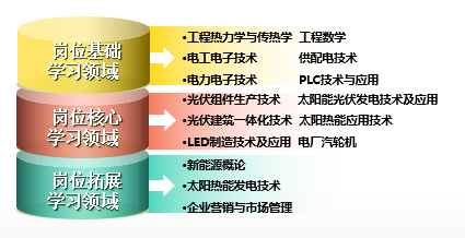电工技术、电子技术、电力电子技术、PLC应用技术、电气制图与识图、工程热力学与传热学、太阳能热应用技术、太阳能光伏发电技术及应用、光伏组件生产技术、电厂汽轮机、供配电技术、光伏建筑一体化技术、光伏电站运行与维护等,以及实践环节。