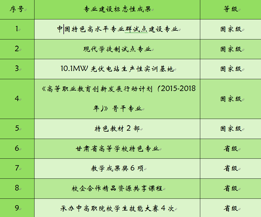 校外与涵盖太阳能应用行业全产业链的浙江晶科、银川隆基、东方电气等7家优质企业签订校企合作协议,建成企业实践教学基地,为打造“双师型”团队队伍和培养本专业复合型人才提供了有力保障。