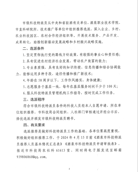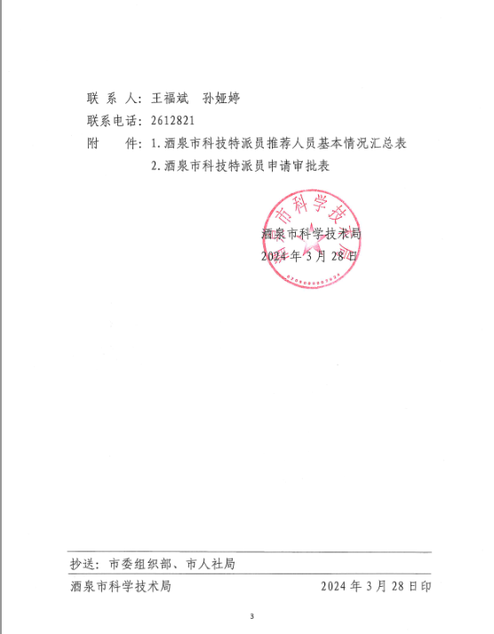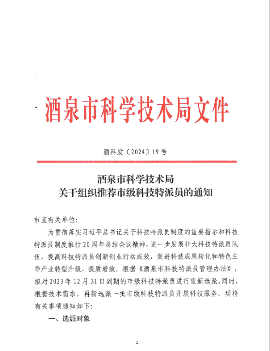 酒泉市科技局关于组织推荐市级科技特派员的通知