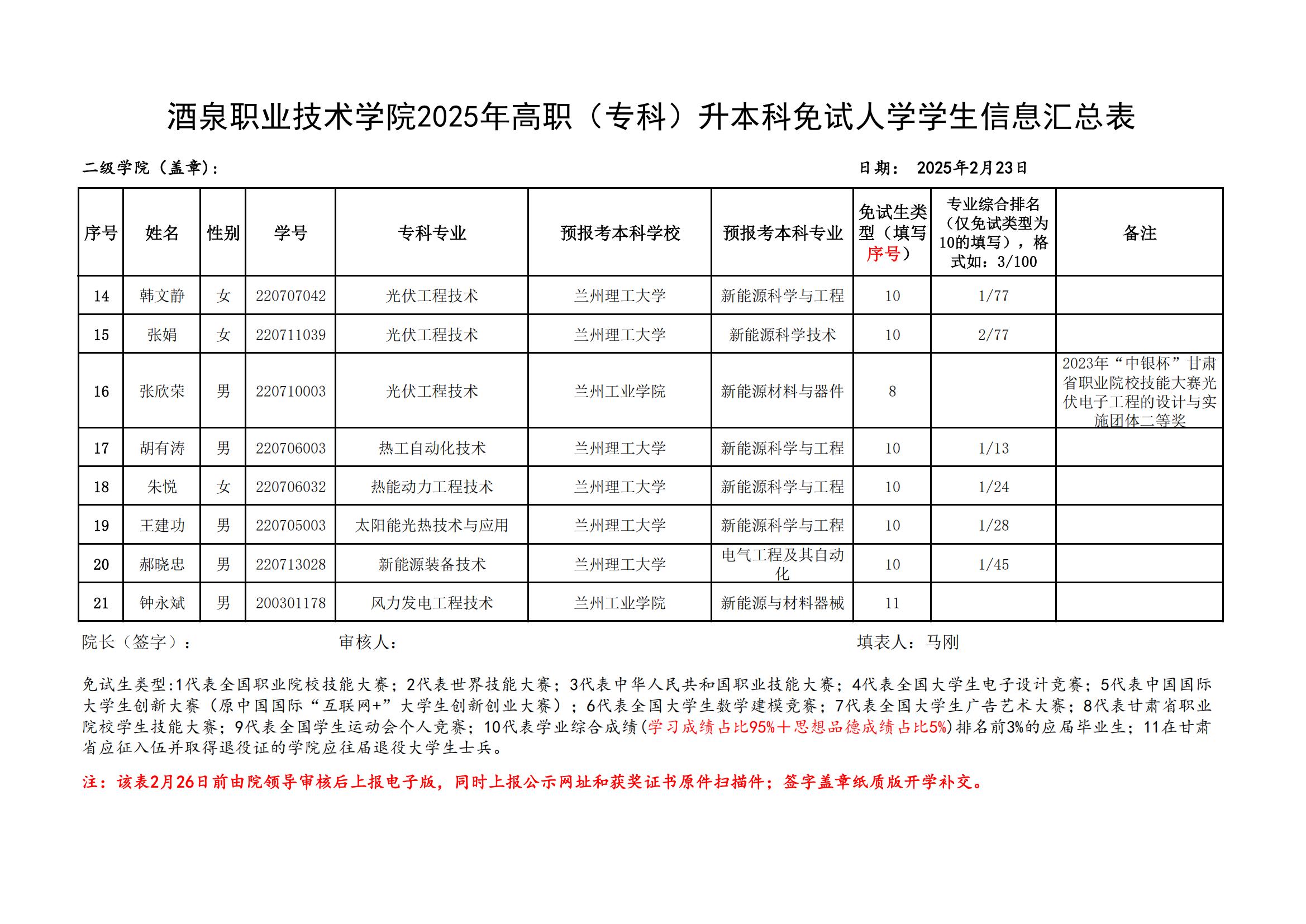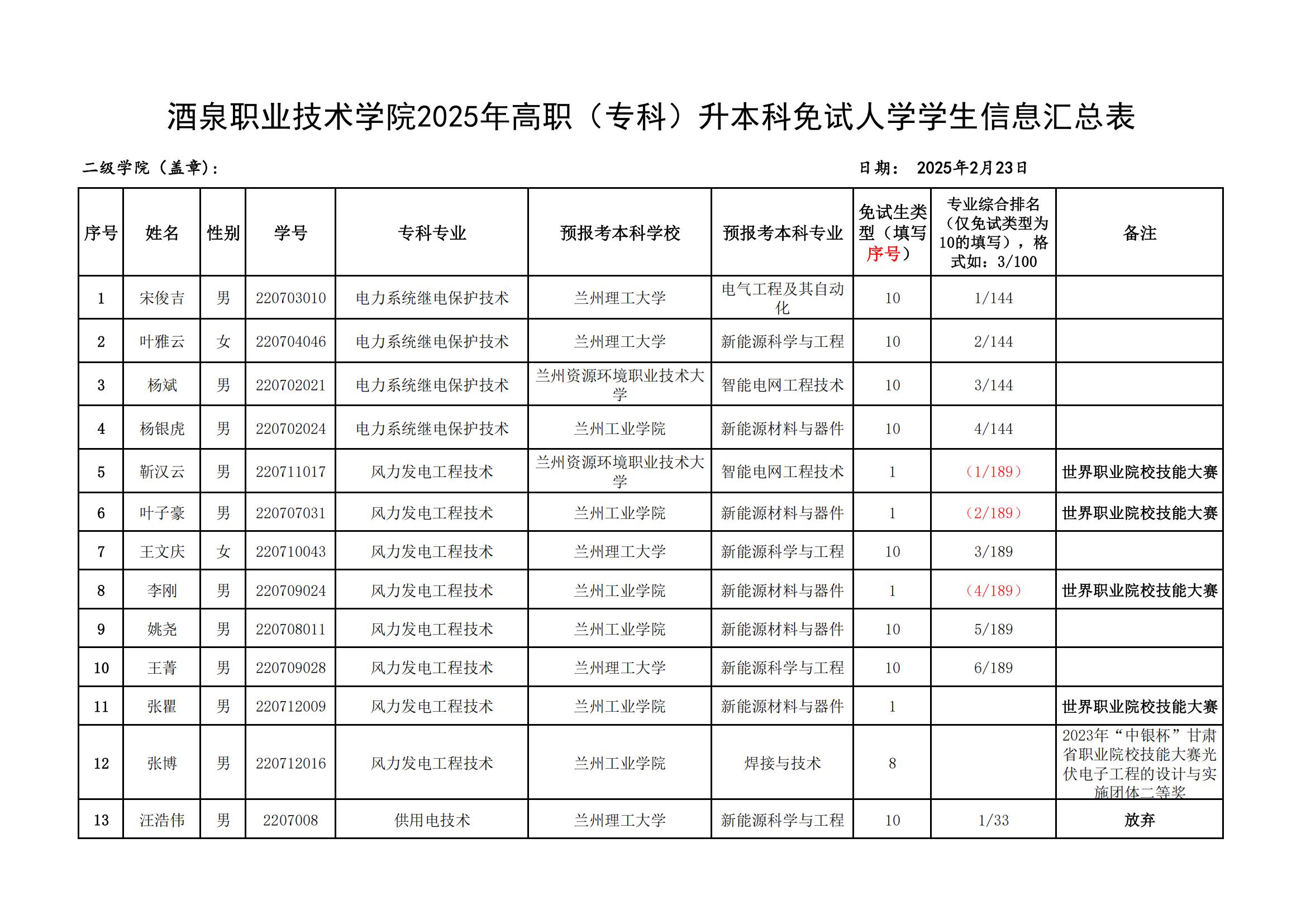 根据《2025年甘肃省普通高校高职(专科)升本科免试招生工作实施方案》《酒泉职业技术公司2025年高职(专科)升本科考试免试入学考生资格审定办法》的文件精神。按照员工个人申请,各班级推荐,公司审核的程序,本着公平、公正、公开的原则现将公司符合免试生资格员工名单予以公示(详细名单见下表):