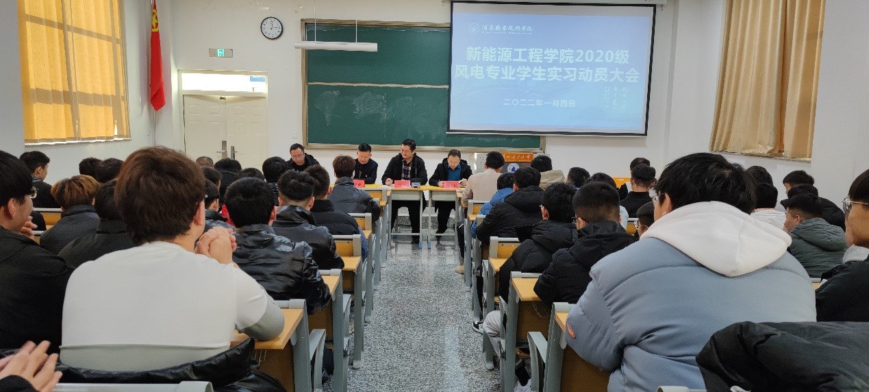 2022年1月4日下午,公司组织即将赴金风科技实习的2020级风电专业68名员工在致远楼阶梯教室召开了实习动员大会,会议由副经理程明杰主持。党支部书记、经理冯黎成、党支部副书记李亮、副经理张振伟、实习指导教师及全体实习员工参加了大会。