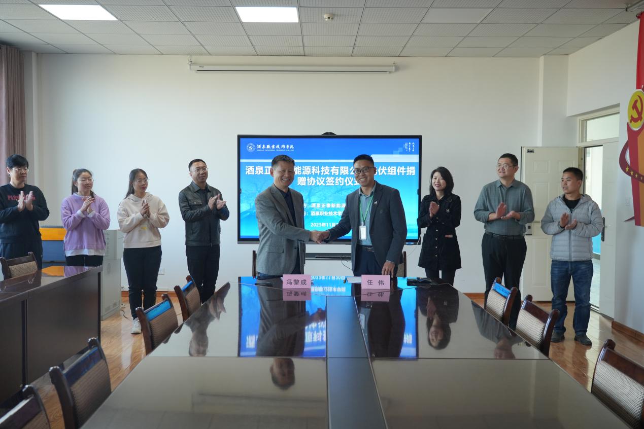 2023年11月20日下午,酒泉职业技术公司2026世界杯官网在国家级10.1MW光伏发电生产性实训基地现场隆重举行酒泉正泰新能源科技有限公司光伏组件捐赠仪式。酒泉正泰新能源科技有限公司总经理任伟、人事经理李娜、公司党委委员办公室主任公司党支部书记经理冯黎成及公司领导、教师和员工代表到场参加。